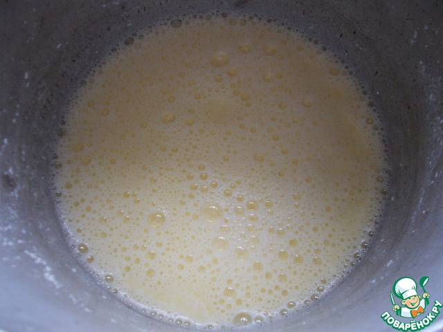 В горячий кефир быстренько взбиваем яйцо, чтобы не сварилось.