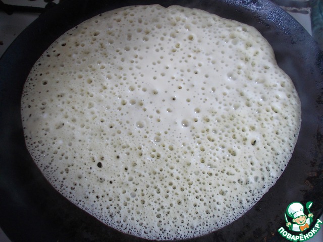 Жарим блинчики. Посмотрите какие пузырьки. Я обратила внимание, чем круче тесто, тем больше пузырьков и дырочек. Так что лучше не делать его сильно жидким.