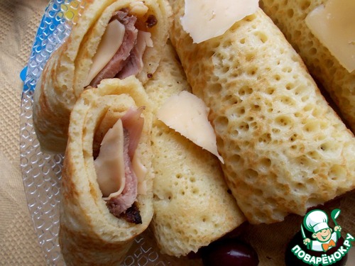 | Предлагаю вам очень вкусный вариант ажурных, дырчатых блинчиков, с потрясающей начинкой и печеного мяса, карамелизированного лука и сыра. Муж прямо мурчал, когда кушал, очень вкусно получилось. Мясо вы можете использвать любое печеное или на гриле, я запекла маленький кусочек с вечера. |