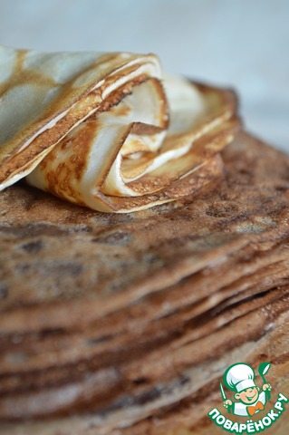 Замешиваем тесто из указанных ингредиентов, в 2/3 теста добавим какао для получения шоколадного цвета и вкуса, 1/3 оставляем как есть. Одну столовую ложку добавляем в тесто, во вторую обмакиваем кусочек сала, смазываем сковороду и печем блинчики. Даем им хорошо остыть.