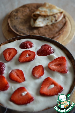 Готовим крем. Желатин замочим в воде и оставим на пол часа минимум. Сметану заранее я откидываю на дуршлаг и оставляю на ночь чтобы отделить лишнюю сыворотку, потому жирность ее не имеет значения при взбивании. Если откидывать времени нет, берите сметану как можно более жирную. Взбиваем сметану с добавлением сахарной пудроы. Распускаем желатин по инструкции на упаковке. Тонкой струйкой вливаем в крем, одновременно взбивая на высокой скорости. Часть крема (около 100гр) оставляем для фруктовой прослойки. 3-4 клубнички перетираем в пюре и перемешиваем с 100гр крема. Если нет такой возможности - добавьте просто пищевой краситель, так торт в разрезе будет смотреться интереснее. Несколько блинчиков смазываем кремом и отправляем в холодильник чтобы желатин застыл и блинчики держали форму.