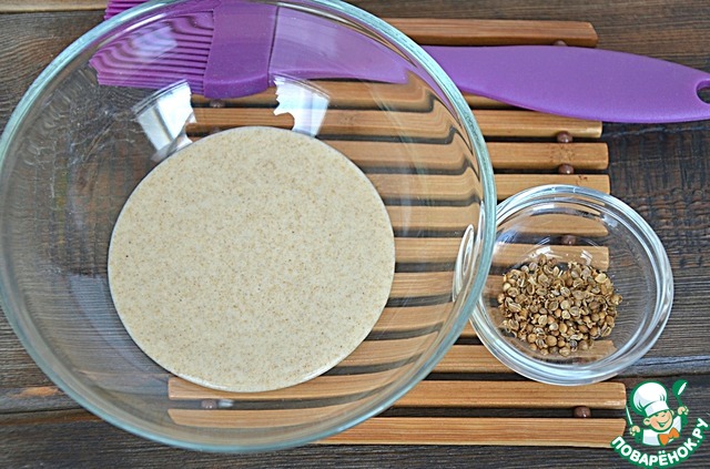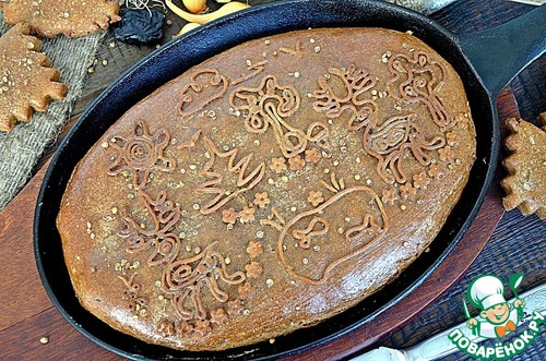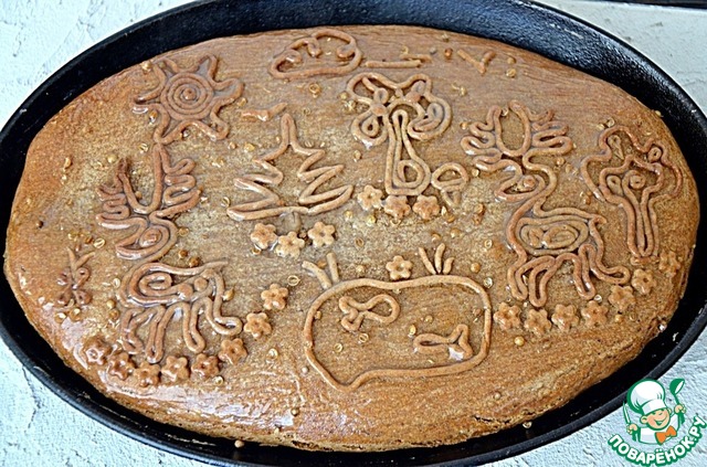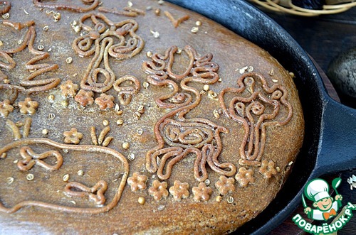 и наносим покрытие на верх пирога, присыпаем любимыми семенами (у меня слегка дробленый кориандр) Выкладываем на мучную болтушку элементы декора, и ставим пирог в разогретую до 200-210 градусов духовку выпекаем пирог до готовности, ориентируясь на особенности своей духовки (у меня ушло примерно 20 мин)