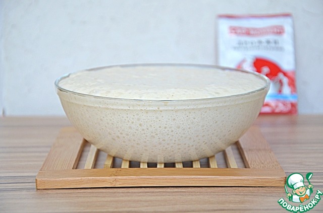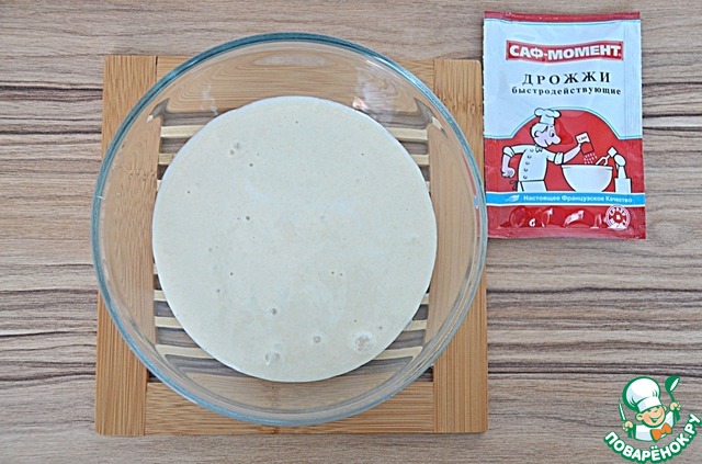 Тщательно перемешиваем опару, накрываем мисочку пищевой пленкой