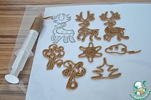 Декор. Я в телефоне нашла подходящую картинку оленя, накрыла экран листом А 4, осторожно карандашом скопировала рисунок, А 4 вложила в пластиковый файл. Кусочек теста помяла в мокрых руках ( три раза смачивала руки) пока тесто не стало очень мягким, скатала из него колбаску и запихнула в аптечный шприц на 10 мл. С усилием выдавливала тесто из шприца и обводила контуры рисунка. Когда первый олень был готов, немного сдвинула А4 в сторону и обвела еще одного оленя, процесс так захватил меня, что я начала рисовать деревья без трафарета, потом захотелось сделать солнышко и т. д.