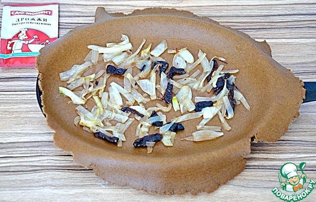 Перекладываем больший пласт в форму, выкладываем половину лука с черносливом,