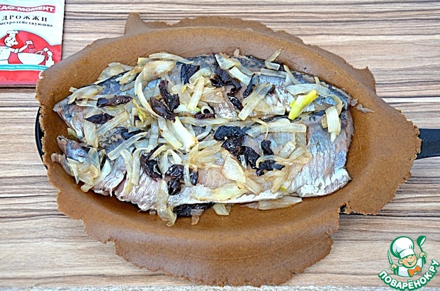 На лук кладем рыбу, солим, перчим по вкусу и накрываем оставшимся луком