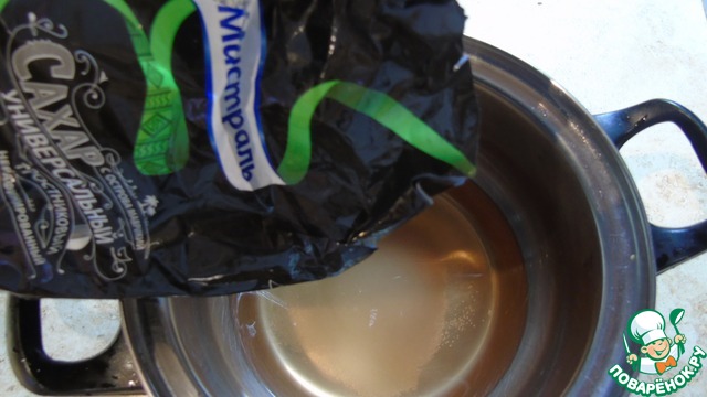 Она: Вино наливает в сотейник и добавляет сахар ТМ "Мистраль"