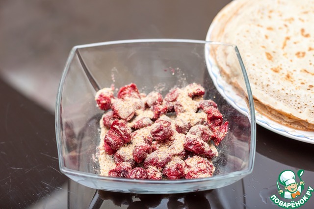 Вишню немного присыпьте панировочными сухарями. Можно, при желании, посыпать вишню дополнительно сахаром и корицей