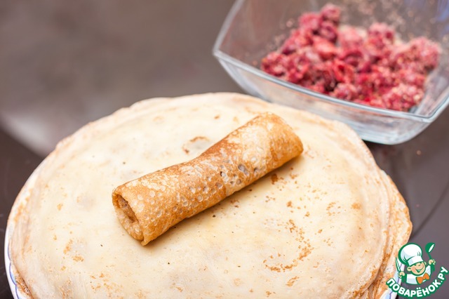 Такие блины едят горячими, с пылу, с жару, пока корочка еще хрустящая, щедро поливая пряным "пьяным" вишневым соусом.