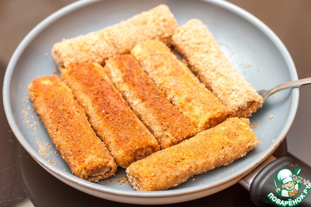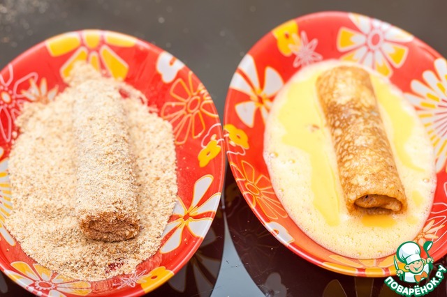 Обмакните каждый блинчик сначала в яйце, затем в сухарях