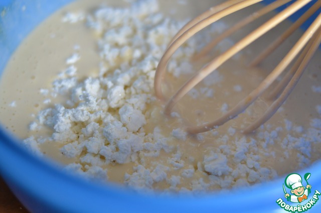 Подаем оладушки теплыми, сверху посыпим творожком и зальем
