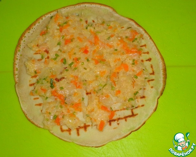 | Аппетитные и сытные блины с начинкой из капусты, тушенной с твердым сыром. |