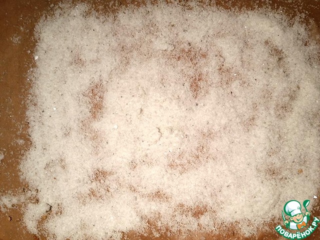 Положите сало на соль и обсыпьте его со всех сторон. Соль не жалейте, сало должно быть закрыто полностью.