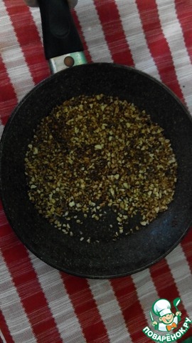 Рубим орех и обжариваем его на сковороде несколько минут.