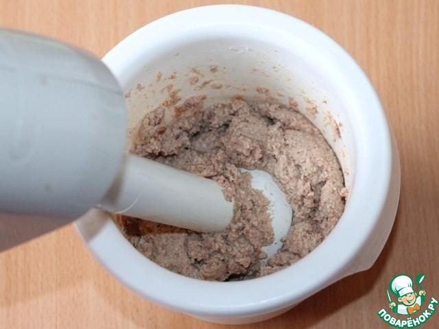 4. Приготовим начинку. Обжаренные кусочки печени кладем в чашу для блендера. Добавляем ветчину, порезанную кусочками и чеснок, пюрироваем.