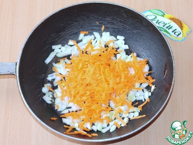 5. Мелко нарезанный лук обжариваем 1-2 минуту на растительном масле. Добавляем тертую на крупной терке морковь и тушим до прозрачности лука.