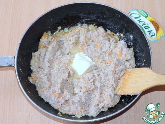 6. Затем выкладываем измельченную начинку, сливочное масло, солим, перчим, перемешиваем и тушим под крышкой 2-3 минуты.