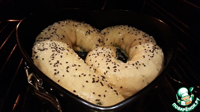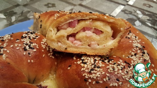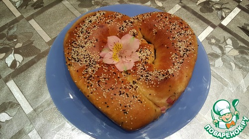 Смазываем верх пирога яйцом с молоком и посыпаем кунжутом. Даём подойти пирогу 15-20 минут. Время зависит от используемых дрожжей и температуры воздуха на Вашей кухне. Отправляем нашего красавца в духовку. Примерно на 40 минут. Ориентируйтесь по Вашей духовке!!!