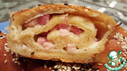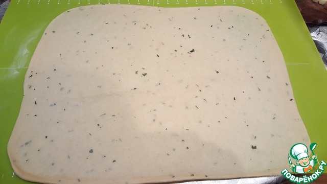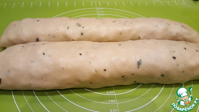 Выкладываем на прямоугольник начинку и сворачиваем рулетом. Поступаем также со второй половиной теста. Защипываем бока и край рулета. У меня получились немного разные по размеру рулеты, но, в конечном итоге, это совершенно не влияет на результат.