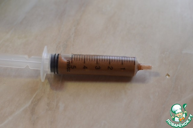От теста отлить приблизительно 150 мл теста. Добавить в него какао и хорошо перемешать. За счет какао тесто станет гуще, это нам и нужно. Далее берем обычный медицинский шприц, снимаем иголку. Набираем в него коричневое тесто, это будет горошек.