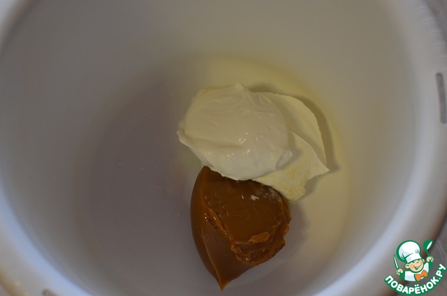 Готовим соус. Сметану, вареное сгущенное молоко и топленое, помещаем в миску. Перемешиваем до однородного состояния. Можно взбить миксером.