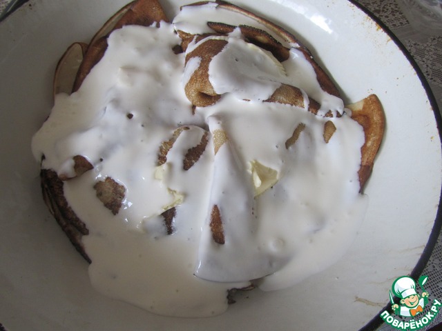 Сметану разводим кипяченой холодной водой до консистенции кефира. Поливаем блинчики и кладем второй слой