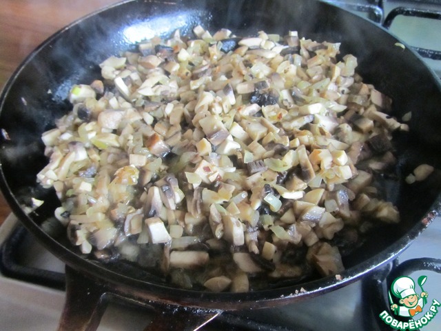 Лучок с грибами обжарить, посолить и поперчить по вкусу