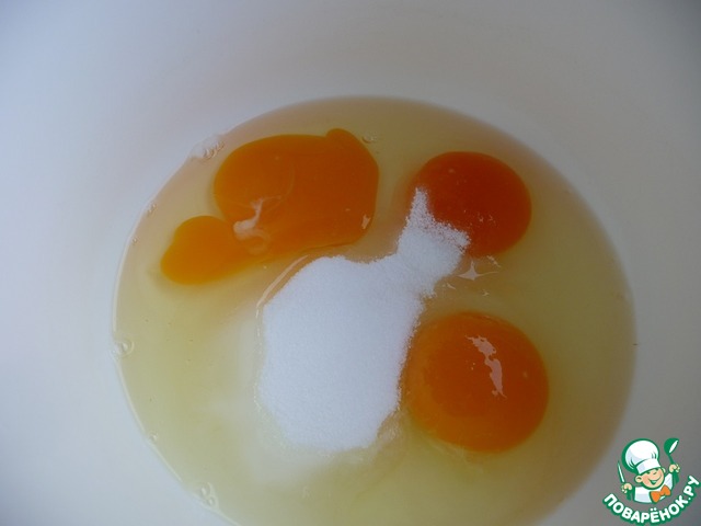 Яйца, соль, сахар, ванильный сахар взбить венчиком или миксером.