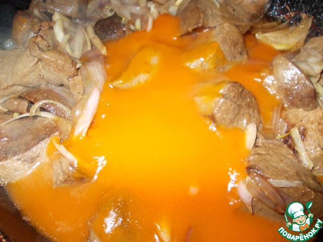 Затем вылейте тыквенный сок, уменьшите огонь и протушите пока не испарится лишняя влага. Посолите, поперчите.