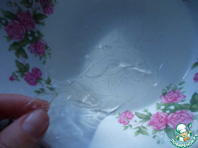 Желатин залить холодной водой, у меня пластинки быстрорастворимого желатина. На каждой упаковке написаны пропорции, на какое кол-во жидкости расчитана пачка. Если используете обычный желатин, значит нужно около 7 г и залить около 50 мл воды.
