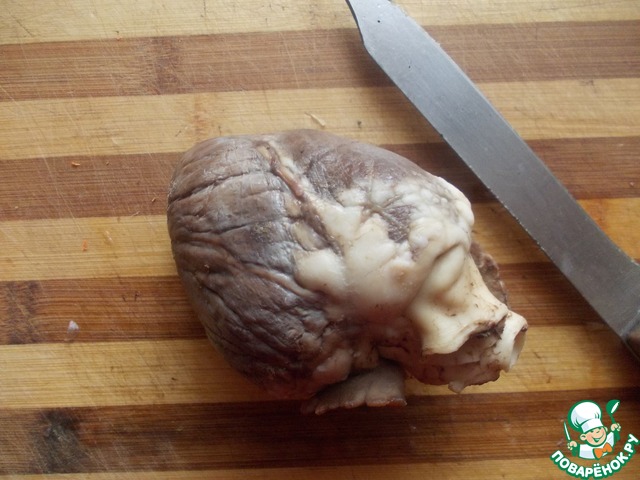 Сердце нужно предварительно отварить до готовность, около 1.5 часа. В кипящую воду отправить сердце, добавить соль, и перец горошком. За 20 минут до конца, добавим лавровый лист. Сердце оставить в том бульоне, в котором варилось, минут на 20, затем вынуть и остудить окончательно. Так получается сочнее.