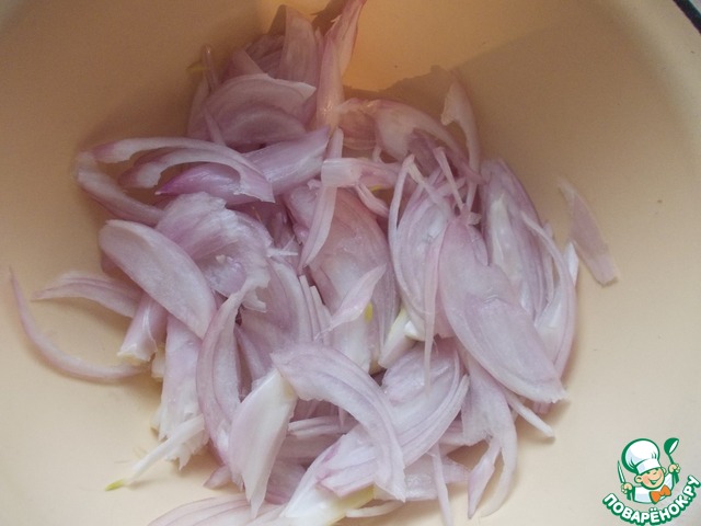 Лук почистить и порезать соломкой, или полукольцами, как вам больше нравится. Можно использовать любой другой лук, сладких и сочных сортов.
