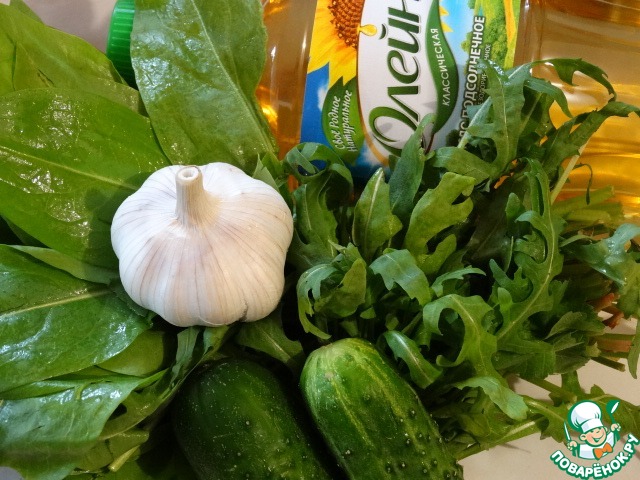 Огурцы, щавель и рукколу промыть и обсушить. Чеснок, один зубчик, очистить.