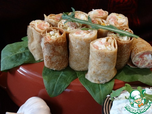 На каждый блинчик положить по 2 столовые ложки начинки, свернуть трубочкой. Поставить в холодильник до подачи.