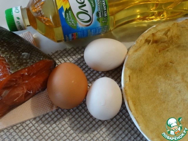Приготовить блины по любимому рецепту. Я пеку по своему многолетнему рецепту, который можно посмотреть здесь: http://www.pov arenok.ru/recipes/sh ow/117082/.