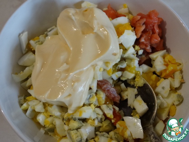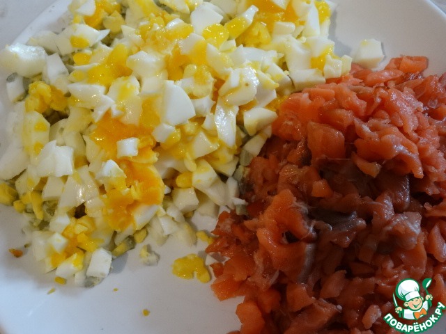 Яйца отварить, очистить и нарезать мелким кубиком.