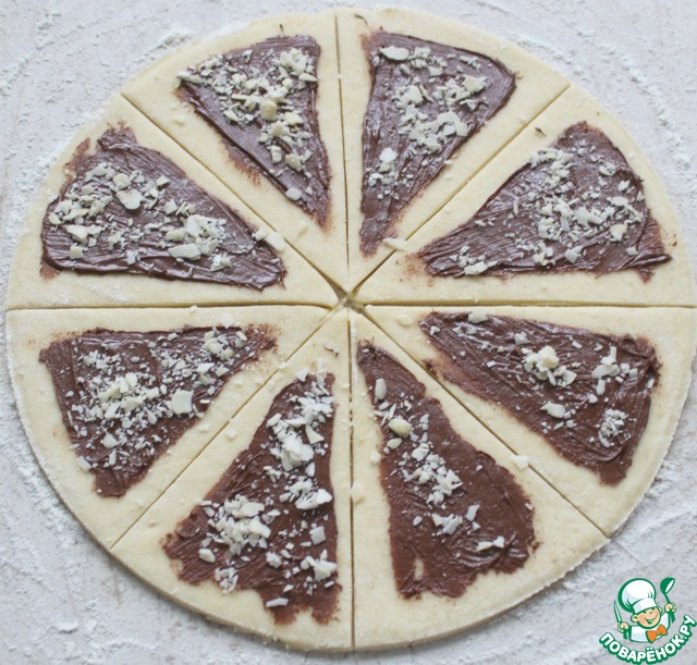 Разрезаем на 8 секторов, наносим шоколадную пасту и посыпаем орехами.