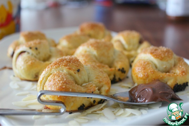 Смазываем желтком и посыпаем коричневым сахаром и кунжутом по желанию.
