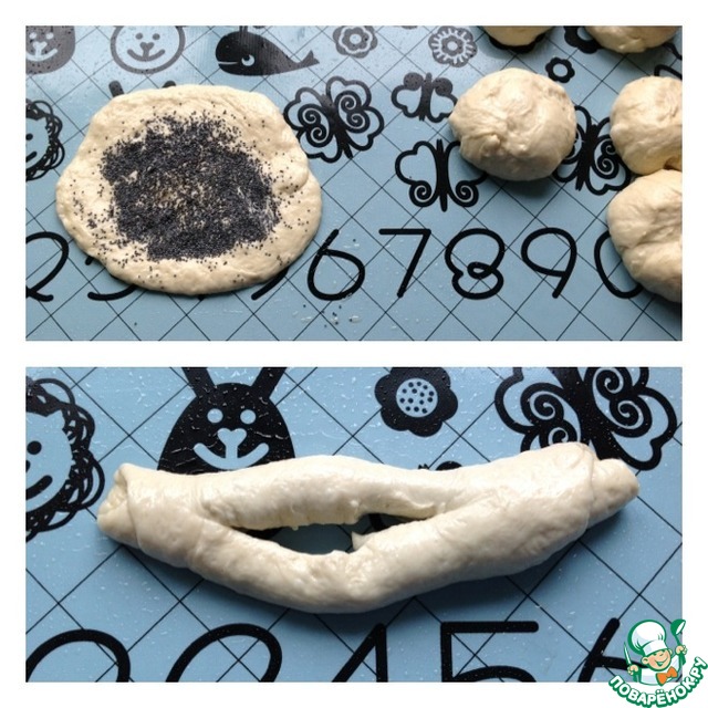 Тесто разделить на шарики как на пирожки, можно чуть больше или меньше. Смотря каких размеров вы хотите получить выпечку. Тесто практически к рукам не липнет, достаточно руки и рабочую поверхность смазать растительным маслом, и муки для подпыла не понадобится. Каждый шарик раскатать в круг. Посыпать маком и прижать его рукой, чтобы не сыпался. Мак не запариваю. Свернуть в рулет и в середине сделать глубокий разрез не доходя до краев.