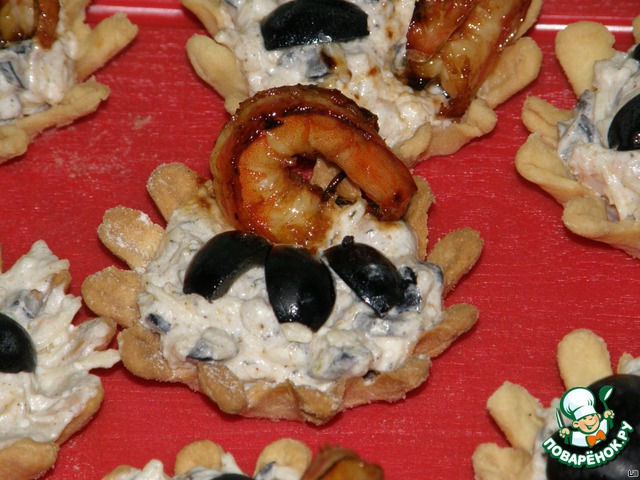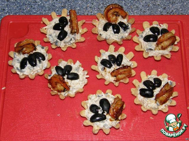 В каждую тарталетку вставляем по 1-ой медовой "королевской" креветочке и украшаем разрезанными маслинками!