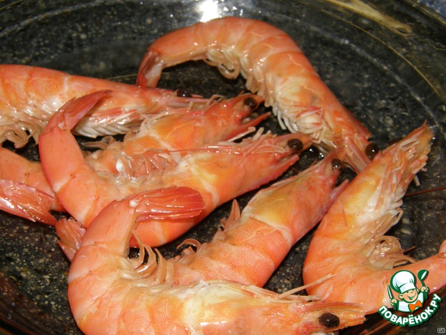 В разогретое оливковое масло кладем очищенные креветки, добавляем 1 ст. л. мёда.