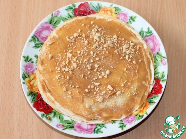 4. Формируем торт. Берем плоское блюдо, укладываем на него блин, смазываем кремом и посыпаем молотыми орешками.