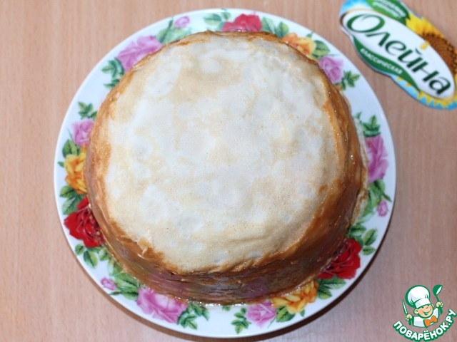 5. Затем кладем следующий блин и повторяем все до предпоследнего блинчика. Верхний блин не смазываем кремом. Остатками крема смазываем бока у тортика.