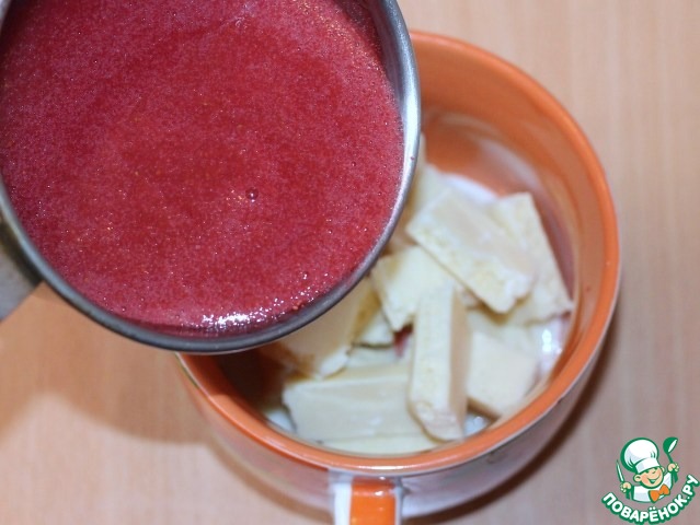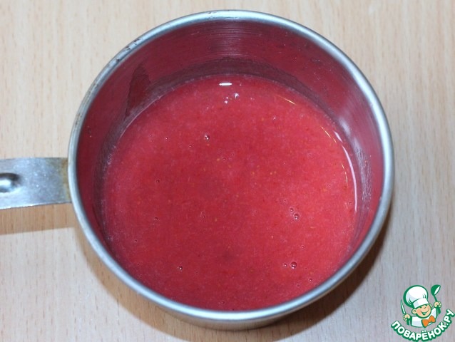 7. Перетираем клубнику через сито (нам нужно 120 мл) и смешиваем с сахаром. Ставим миску на тихий огонь, доводим смесь только до кипения.