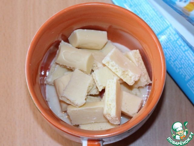 8. Кладем в глубокою чашу дольки шоколада и сгущенку.