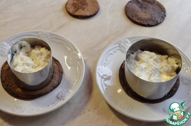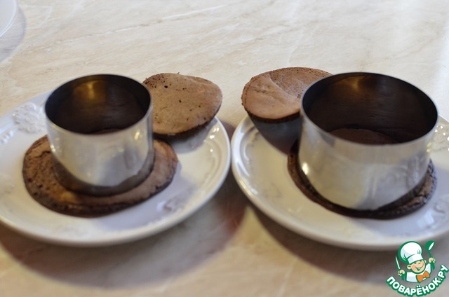 Для сбора десерта, я использовала кулинарные кольца. вырезаем из панкейков 4 круга. По одному ставим вниз кольца.