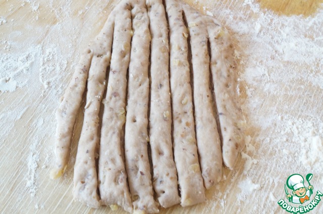 Разрезать овал на полосочки, слегка не дорезая до верха.