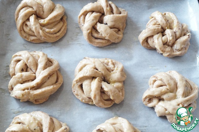 Булочки выложить на противень застеленный смазанным пергаментом. Дать булочкам расстояться, затем смазать их желтком и выпекать в духовом шкафу при температуре 180 градусов до готовности.