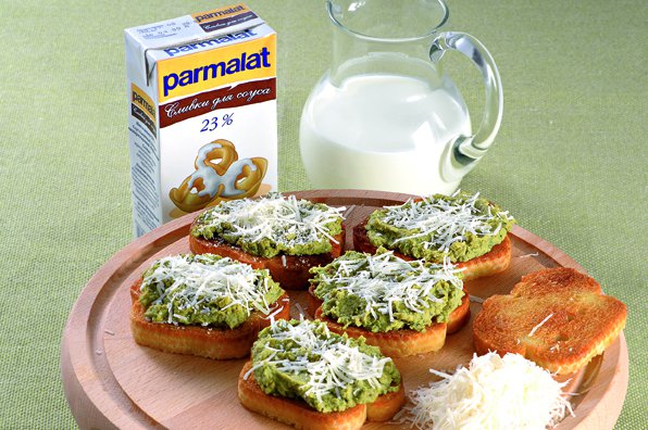 | Брускетта со сливочным пюре из консервированного зеленого горошка со свежей мятой. Рецепт от PARMALAT. |