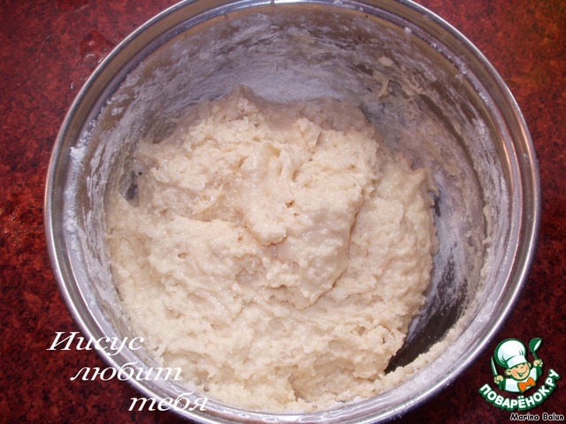 Всыпаем стакан-полтора муки (все зависит от того, насколько густой рис у вас получился). Перемешиваем. Тесто должно получиться мягкое и густое, но не такое густое, чтобы качалкой катать.